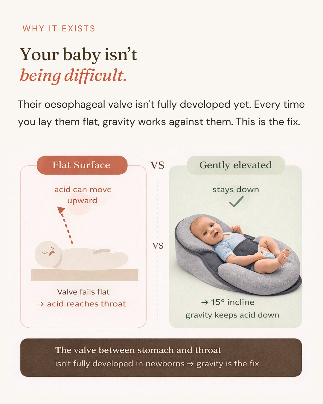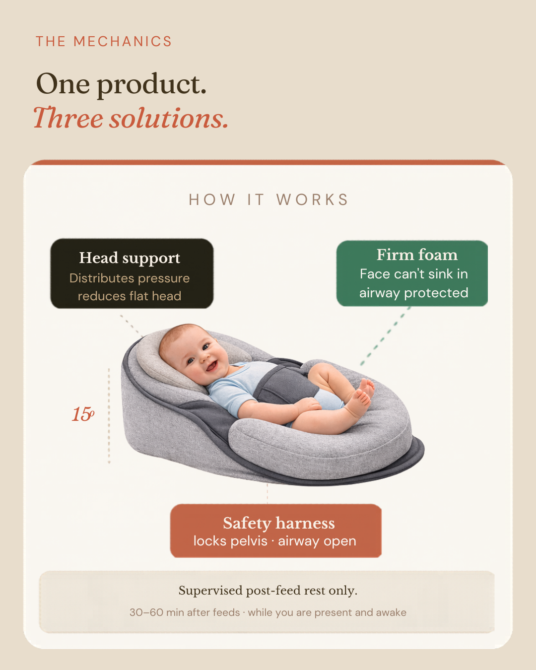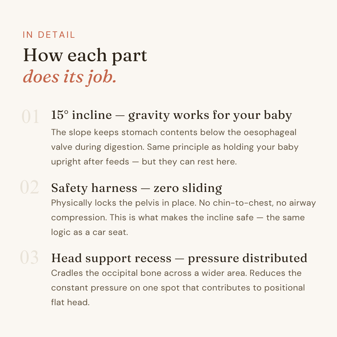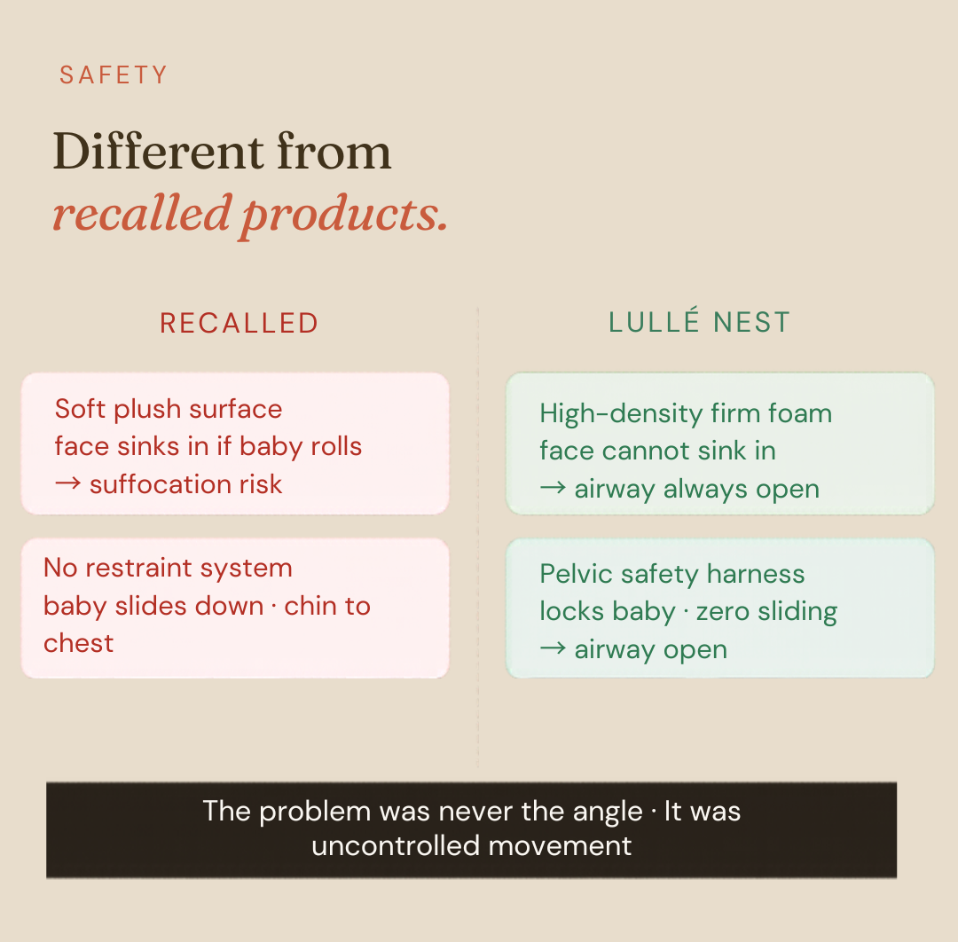 Yes — products like the Fisher-Price Rock 'n Play were recalled because of soft surfaces and no containment. Babies slid down, chin to chest, blocking the airway. The danger was never the angle — it was uncontrolled movement on a soft surface. The Lullé Nest uses a firm foam and a pelvic harness that eliminates that sliding entirely.