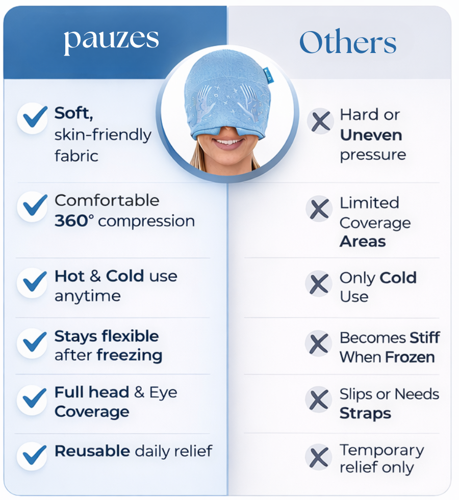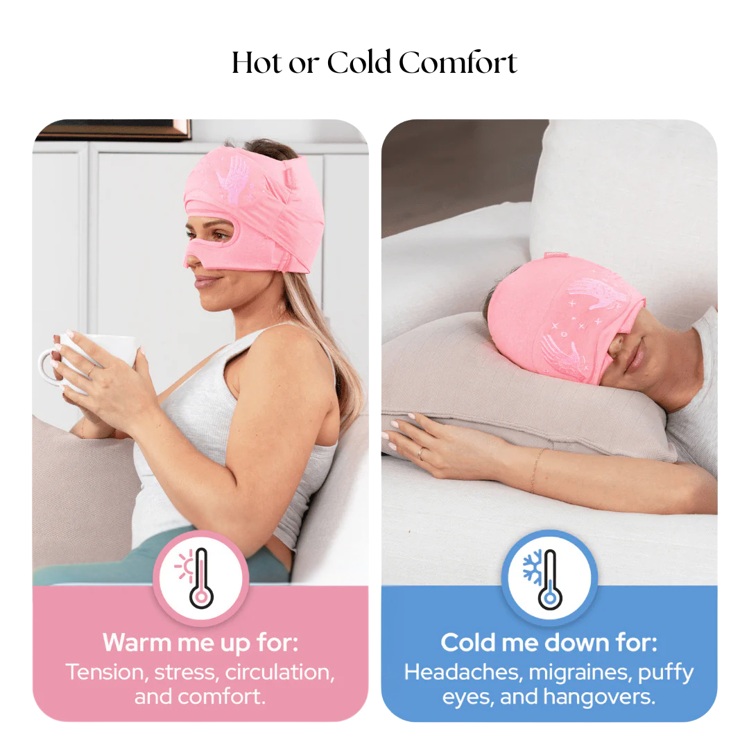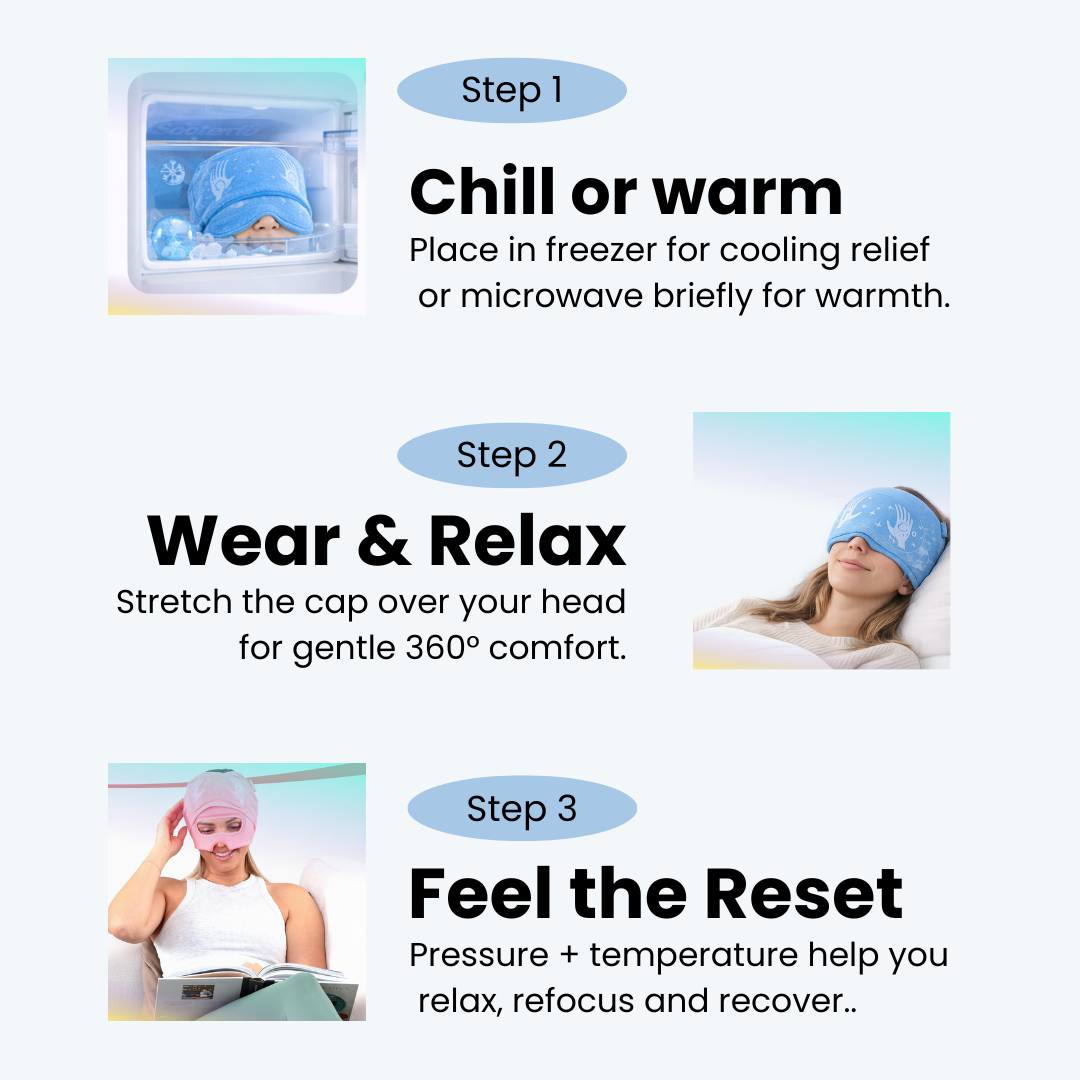 Place the cap in the freezer for cooling comfort or warm it gently in the microwave for soothing warmth. Wear it whenever you need relief from head tension, stress or tired eyes.